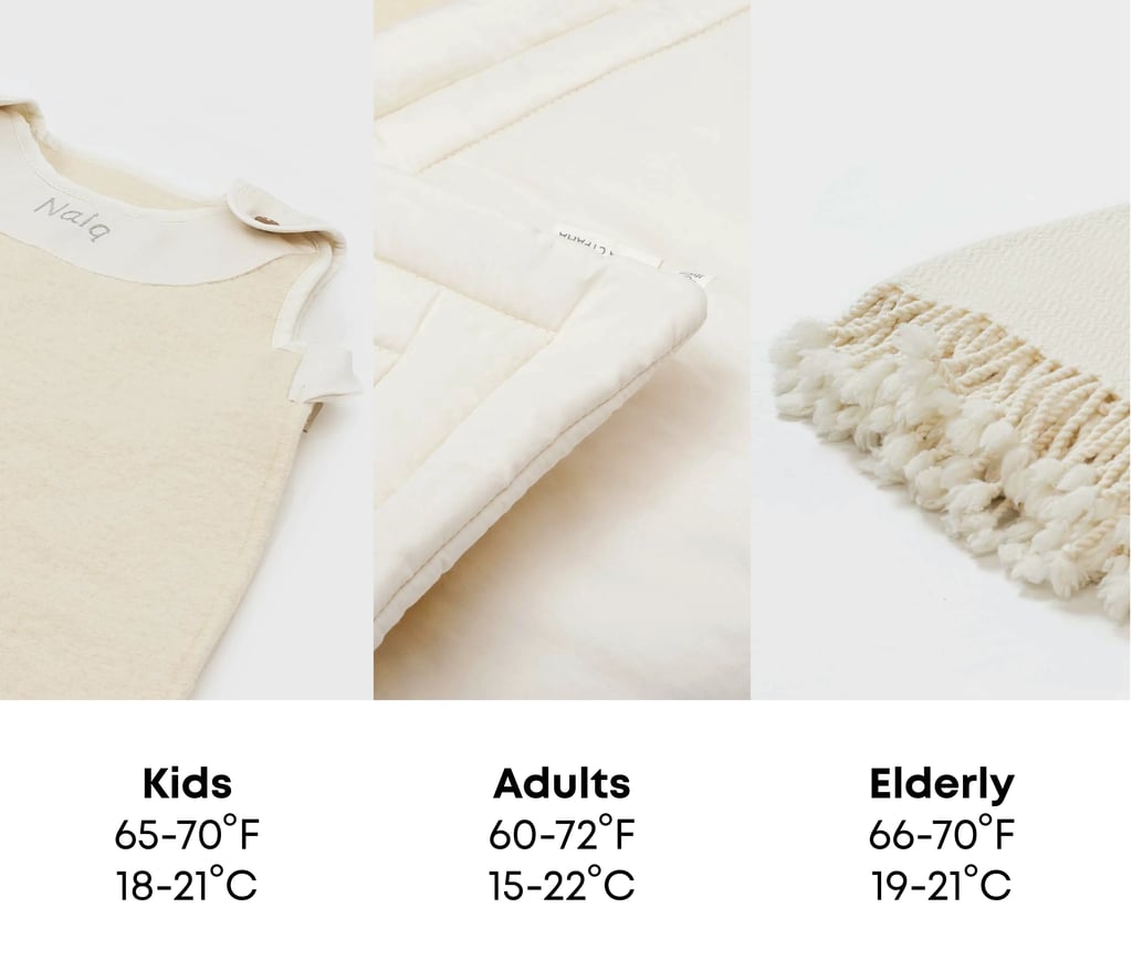 The ideal sleeping room temperature changes with age and with the elderly it would be anywhere in the range of 66ยฐF to 70ยฐF (19ยฐC to 21ยฐC). The best way to enjoy the benefits of good sleep would be to use natural and most importantly breathable materials, like cotton and wool, that regulate the body temperature and isolate well, allowing you to forget about the late-night sweats or shivers. A wool bedding set would regulate the body temperature like no other material keeping you dry and comfortable throughout the night. As the sleep is getting shorter with age why not try making it sweeter with all breathable, synthetic-free, and natural bedding materials?