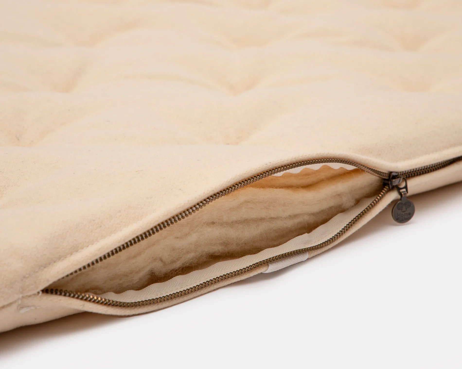 Vores madrasoverlay fyldt med uldvat er det perfekte valg, hvis du vil friske din seng op uden at udskifte madrassen. Den er fyldt med økologisk uldvat og giver blød komfort med en fastere fornemmelse sammenlignet med vores løse uldfyldte overlay. Med en tykkelse på 2,5 cm holder den overfladen stabil og velafbalanceret.