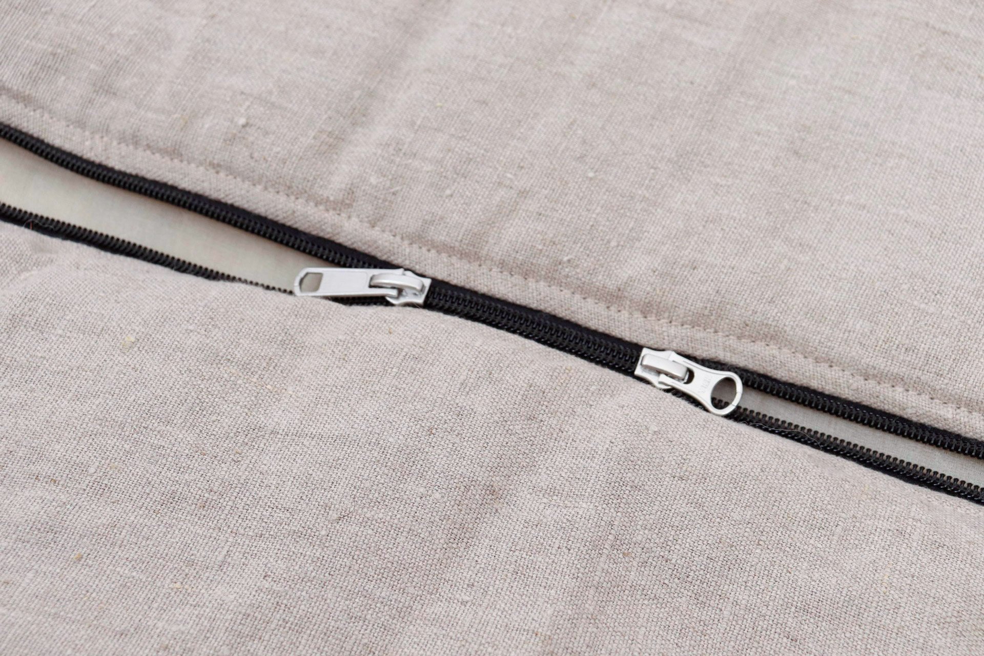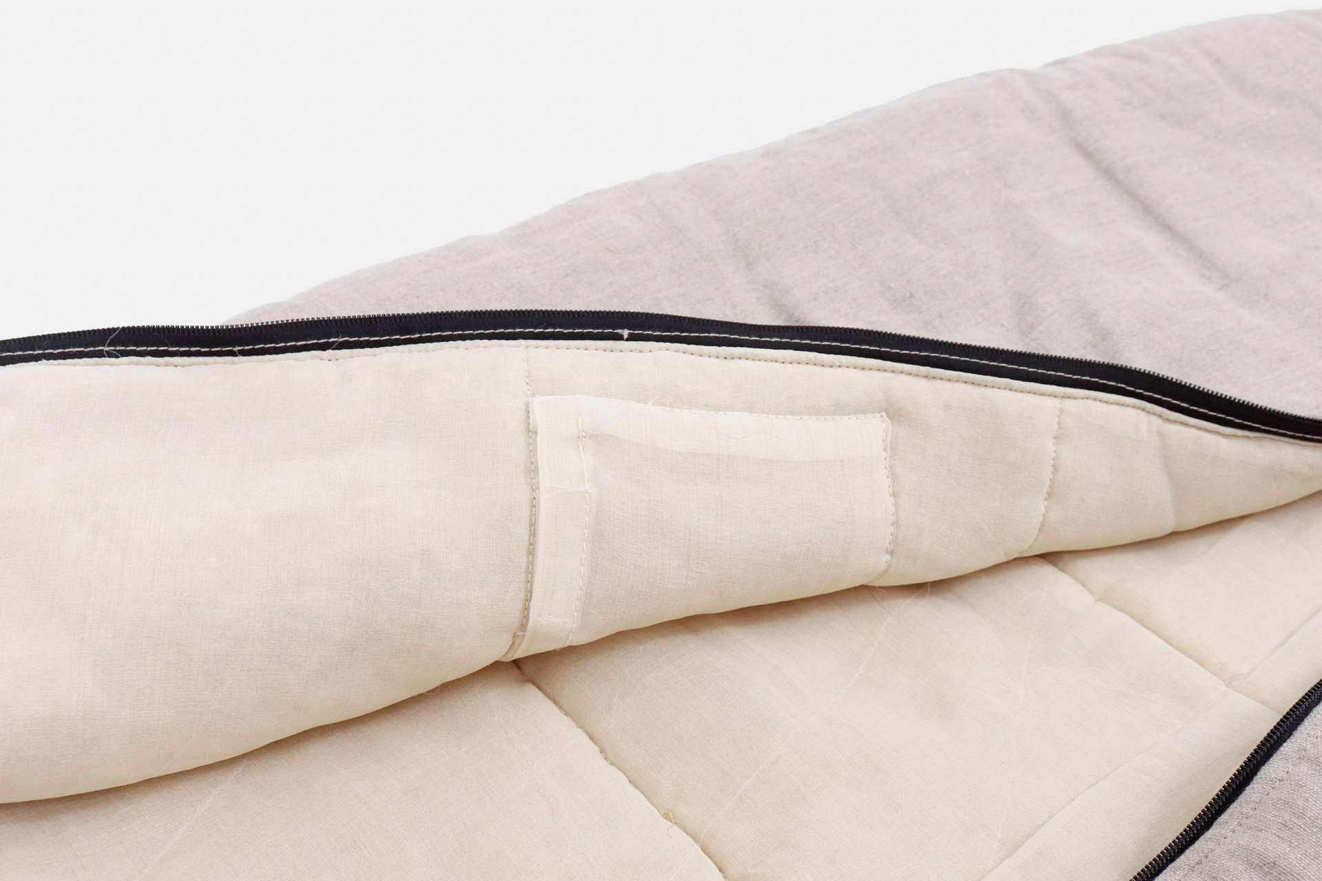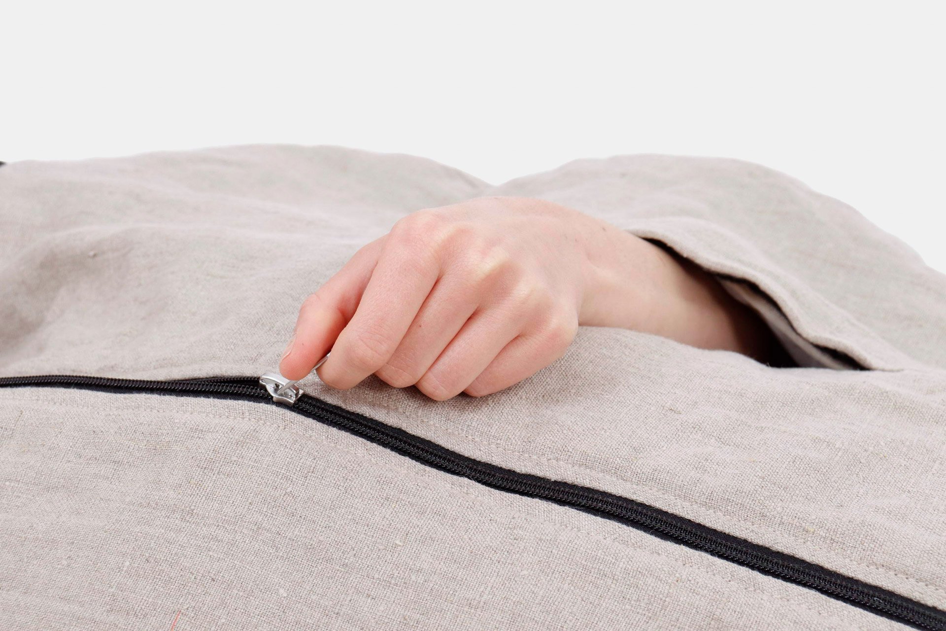 Die รคuรere Hรผlle ist aus strapazierfรคhigem, OEKO-TEX-zertifiziertem Leinen genรคht. Das Innenfutter aus Maulbeerseide fรผhlt sich sanft und beruhigend auf der Haut an. Es reduziert auf natรผrliche Weise Raschelgerรคusche und hilft Ihnen, ungestรถrt einzuschlafen. Die Details bieten sowohl Komfort als auch Funktionalitรคt:
