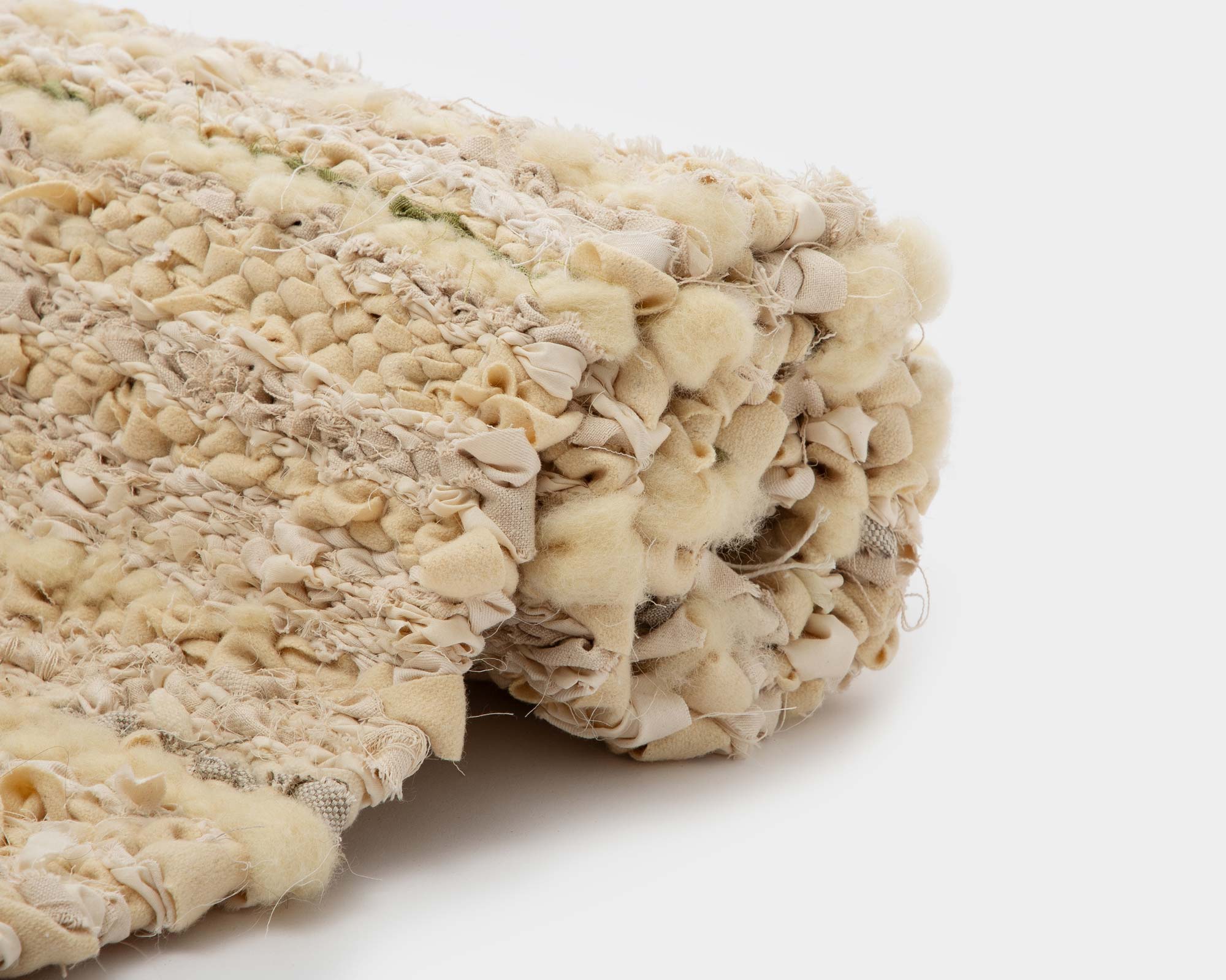 Nous tissons ce tapis rustique à la main, à l'ancienne. À la main, sur un simple métier à tisser. Les matériaux proviennent de ce que nous avons déjà : de la laine biologique et des restes de tissu provenant d'autres projets. Rien n'est gaspillé. C'est ainsi que fonctionne notre mission zéro déchet. Le tapis présente de légères variations de couleur et de texture, propres à l'artisanat.