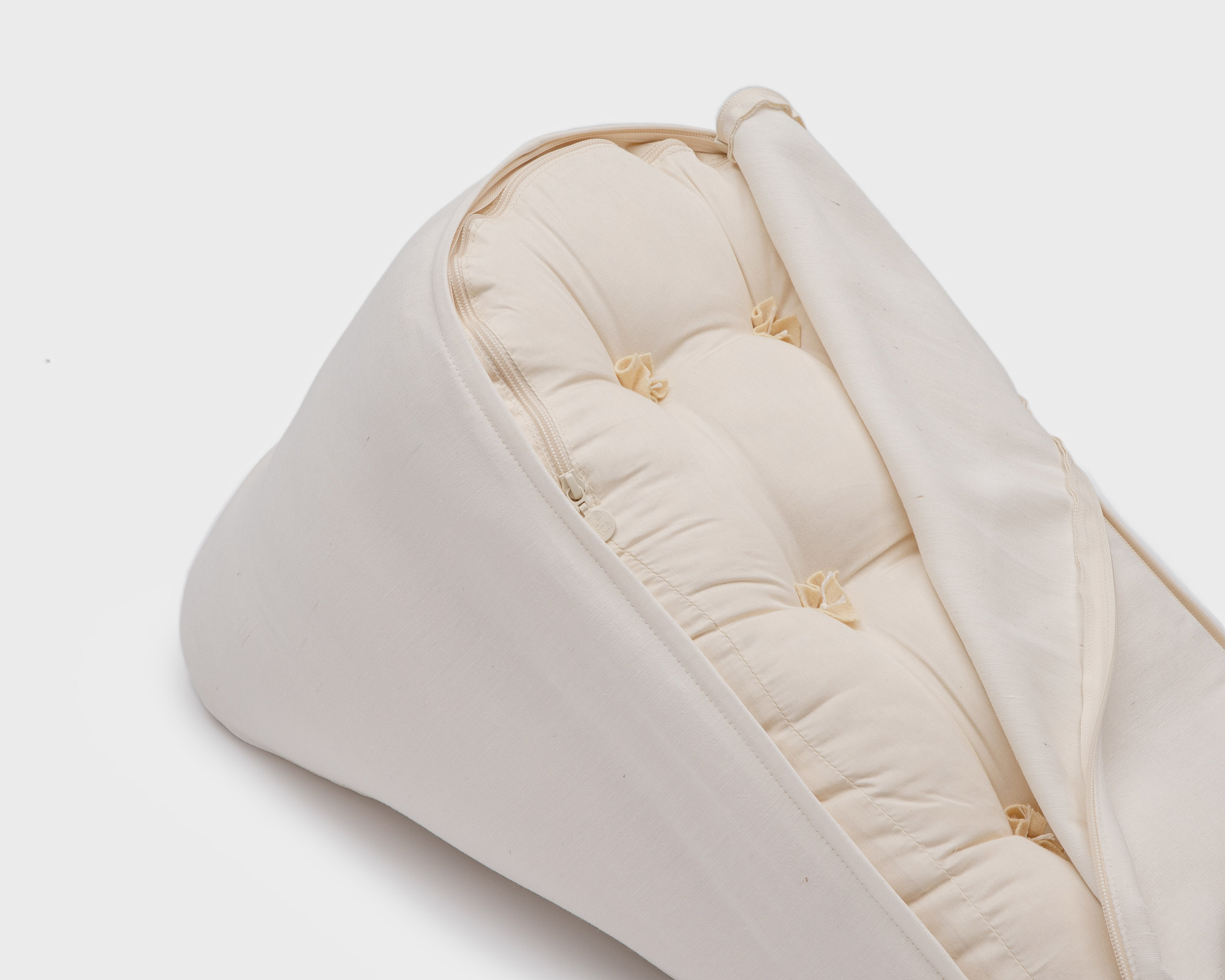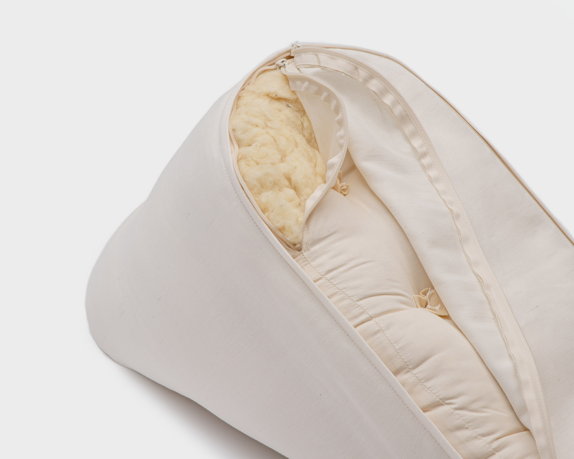 Innlegget er laget av økologisk bomull, og ullen inni er tuftet med sterk linnetråd. Du fullfører puten din med et avtakbart trekk laget av økologiske stoffer. Vi har valgt glatt morbærsilke for å gi et luksuriøst preg. Merinoulljerseyen gir mykhet og behagelig varme. Bomulls-linblandingen er perfekt for varme sommerdager når du trenger en kjølig følelse og naturlig komfort. Med målene 25 x 65 x 39 cm gir størrelsen optimal støtte for kroppen din og gjør lesingen virkelig behagelig.