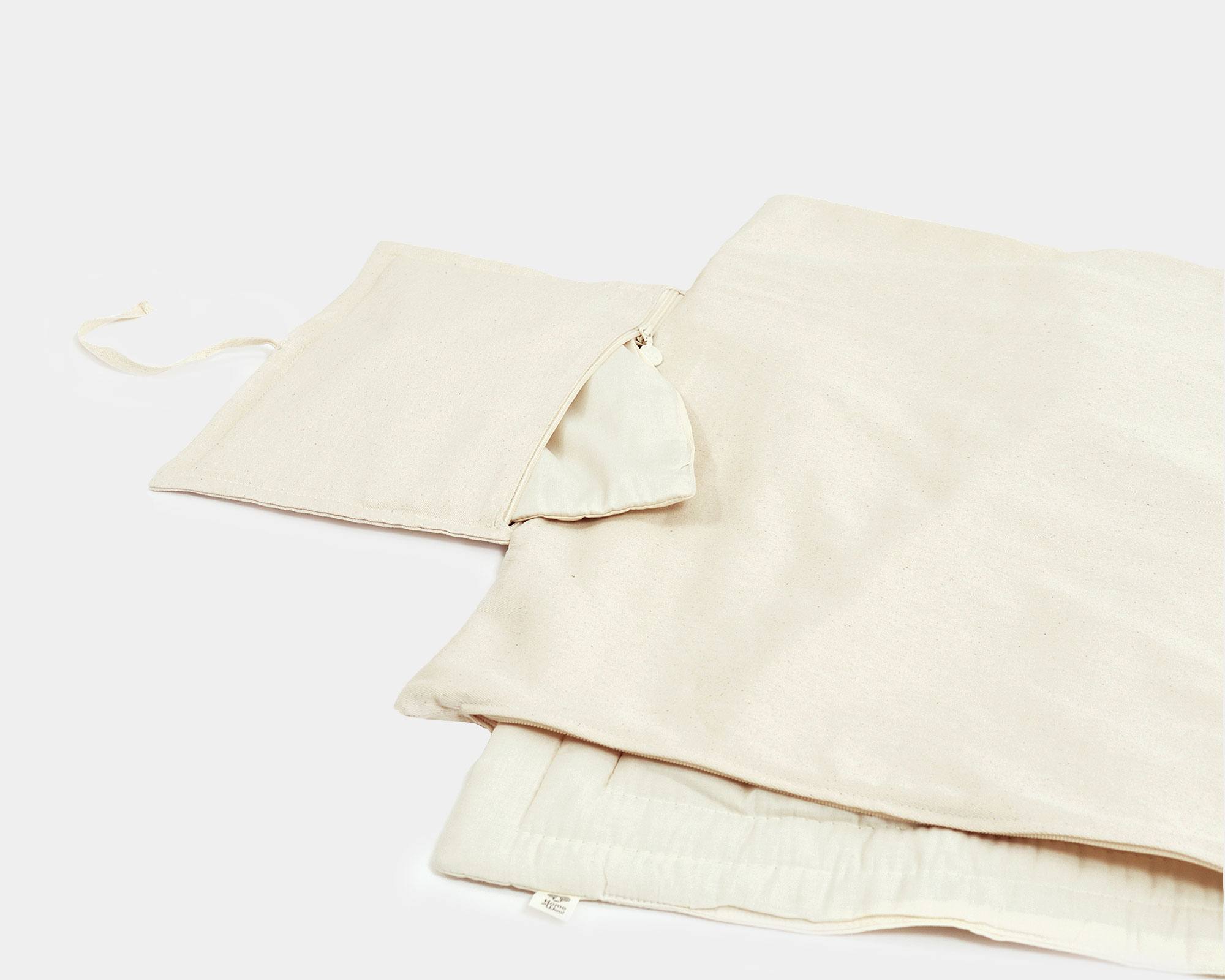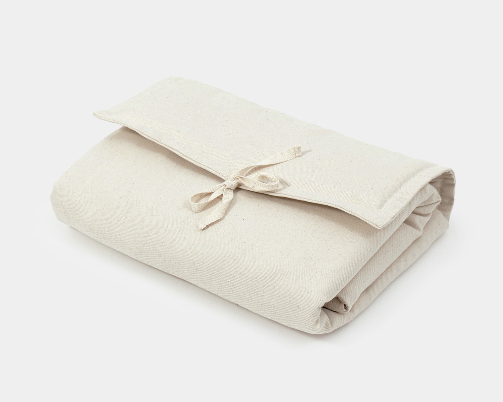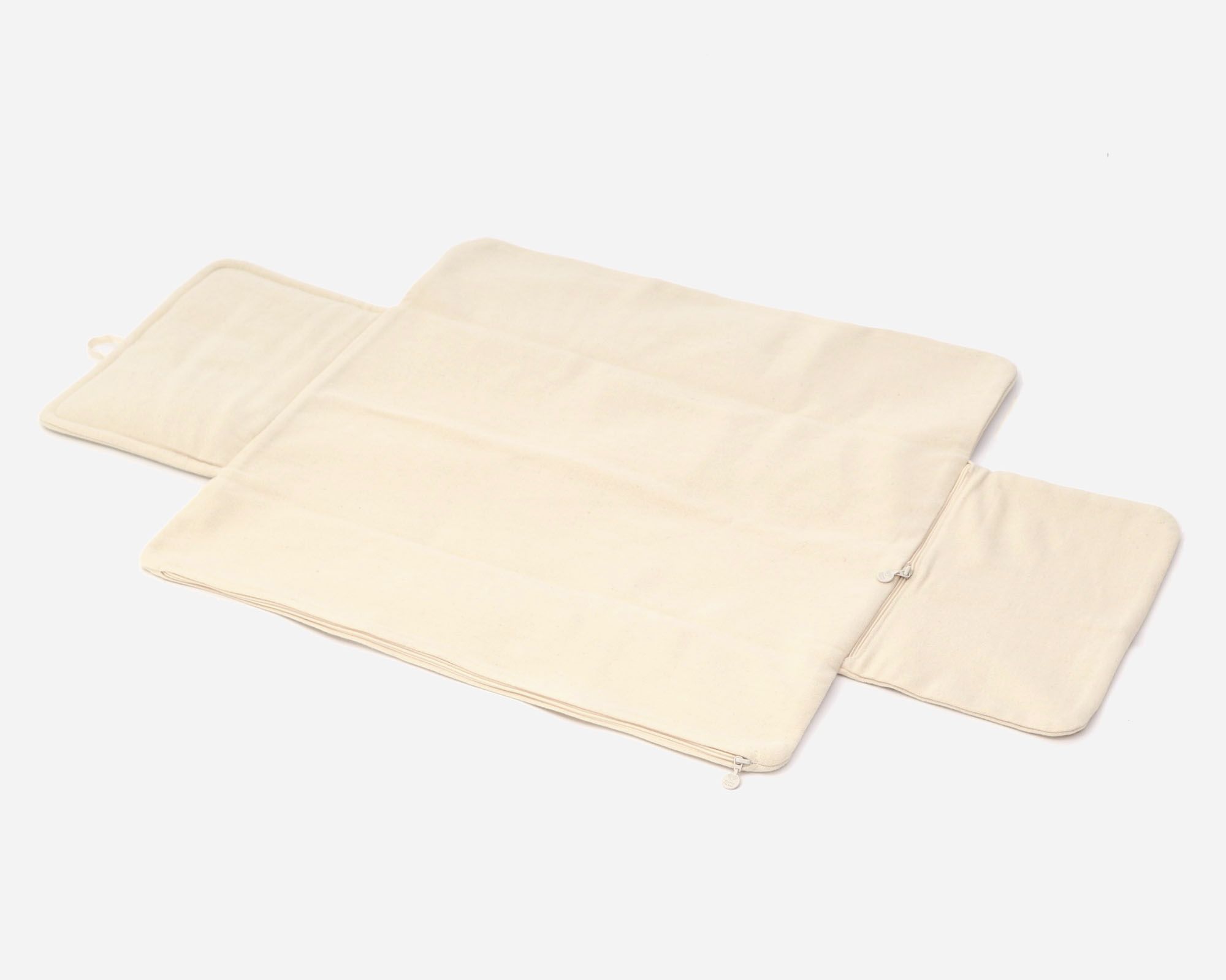 The cover is made from your choice of organic fabric: organic cotton or virgin wool. It unzips for easy washing, so you can always keep it fresh. A small pocket offers space for wipes and cream. The ties keep the pad folded when you are on the move.