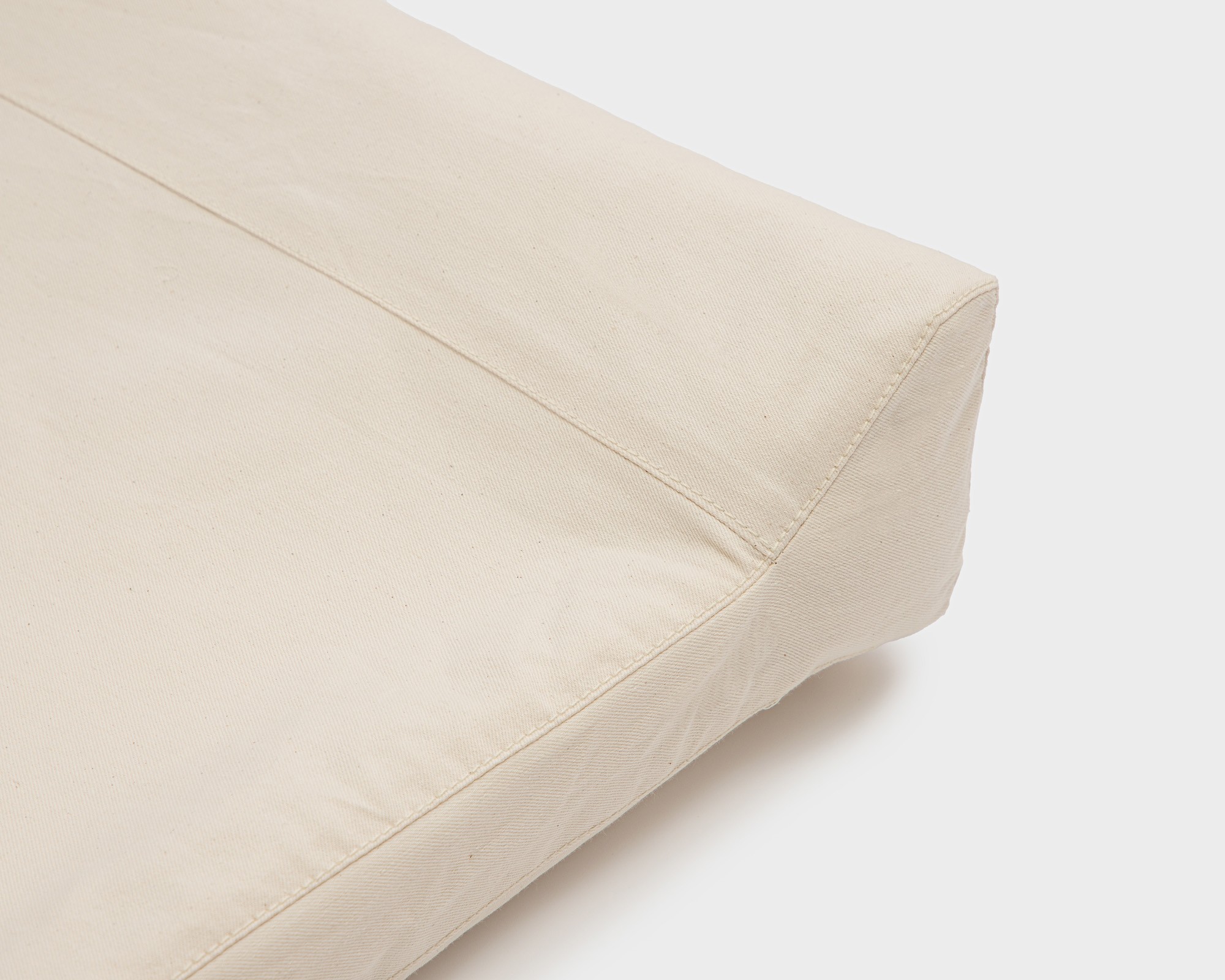 Vi ville ha en kemikaliefri skötbädd som faktiskt känns plastfri, en som doftar svagt av natur och inte av fabrik. Ytan, tillverkad av ekologiskt tyg, förblir sval och mjuk; insidan, ren ull, rör sig med luften så att ditt barn känner sig bekvämt under blöjbyten eller babygymnastik.